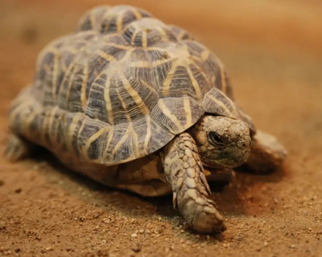 La tortue étoilée indienne a une construction robuste et robuste, avec des membres solides qui lui permettent de naviguer sur différents terrains. Ses pattes sont équipées de griffes acérées, qui l'aident à creuser des terriers pour s'abriter et à chercher de la nourriture.